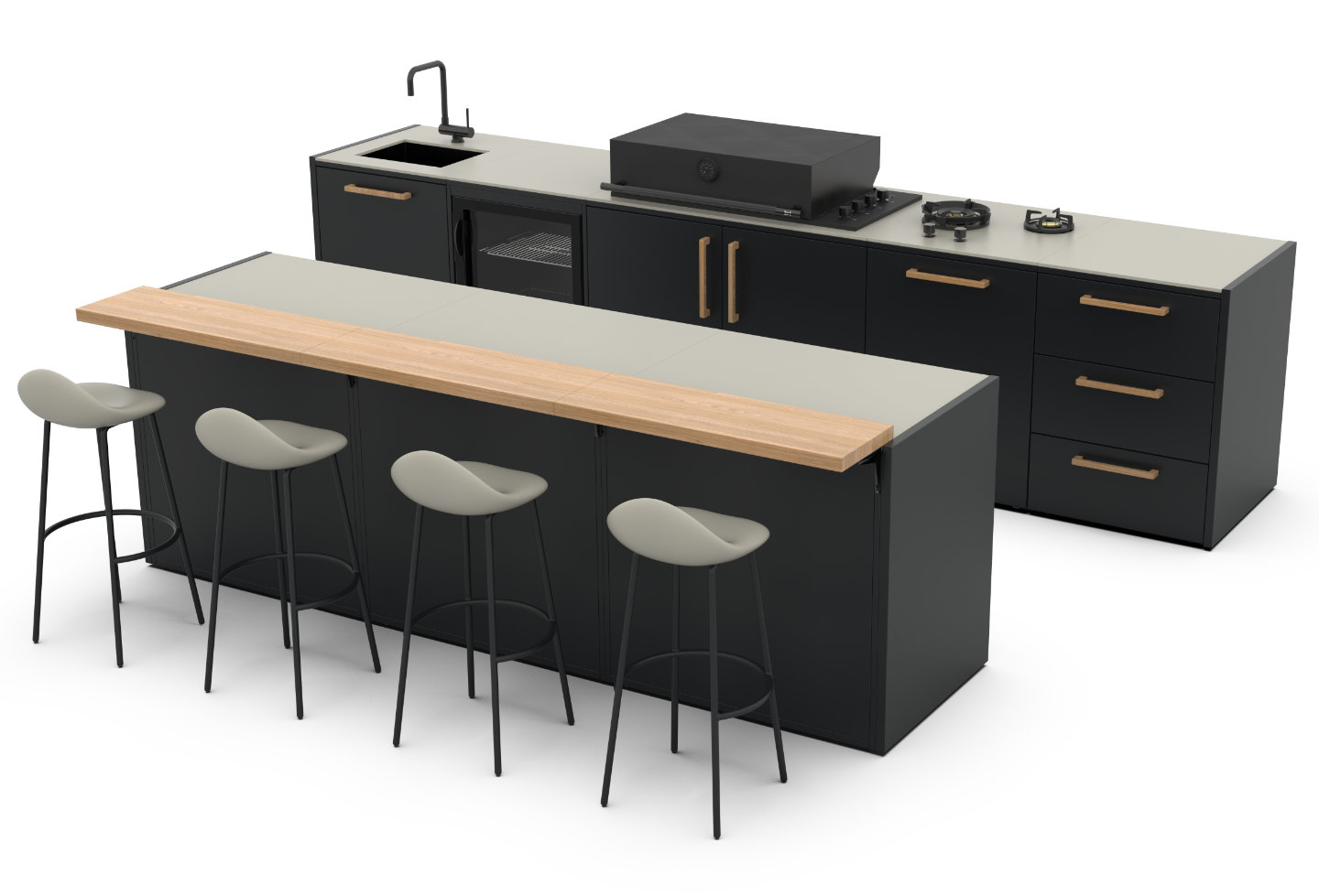 Brabura steht für ein modulares Outdoor Küchensystem, das sich flexibel konfigurieren lässt – mit Grill und Plancha als zentrale Koch­ele­mente und mit passenden Küchen­modulen für Arbeits­fläche, Stau­raum und Komfort.