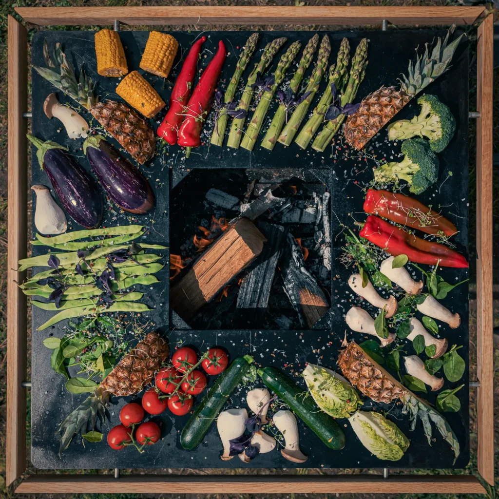 Feuergrill Feuerplattengrill mit 80 × 80 cm Platte und mehreren Hitzezonen – Kochen und Grillen am offenen Feuer.